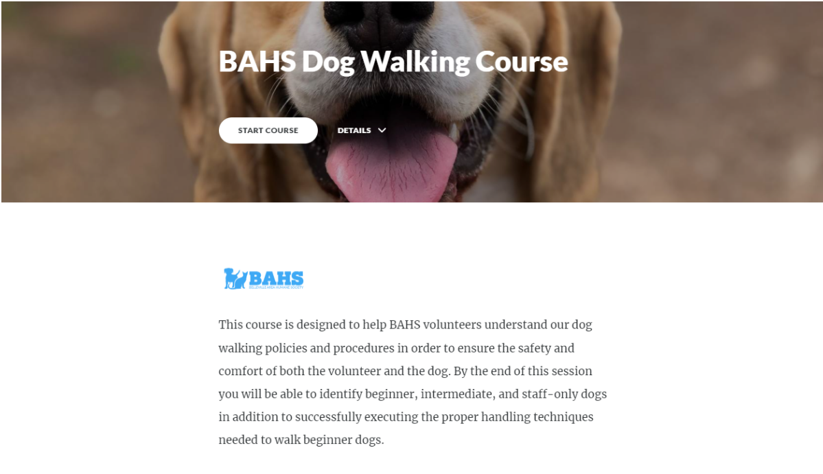 Using Articulate Rise, I designed and developed this course for a local animal shelter. Working with stakeholders and SMEs from the organization, this course was created to train the shelter's new volunteers on the policies and procedures in place to safely walk beginner level dogs. Topics covered include kennel protocol, leash handling, situational awareness, and dog body language. Below, you will find the course analysis, the certificate of completion, a screenshot of the course intro page, as well as select artifacts from the course.