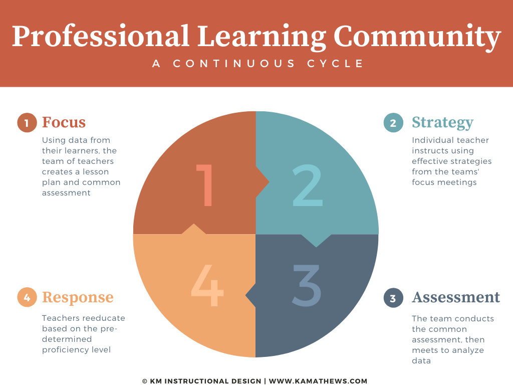 I created this infographic using the graphic design platform Canva. It acts as a visual representation for the cyclical nature of professional learning communities within a public school system. The infographic features each stage of the PLC process with brief descriptions of the key elements needed in order to move to the next stage.