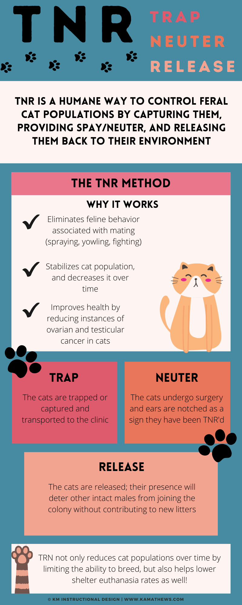 This infographic was made using the graphic design platform Canva. It was designed to help show an overview of the TNR (trap, neuter, and release) program that many shelters and humane societies use to help control the population of feral cat colonies without resorting to inhumane methods such as euthanasia.
